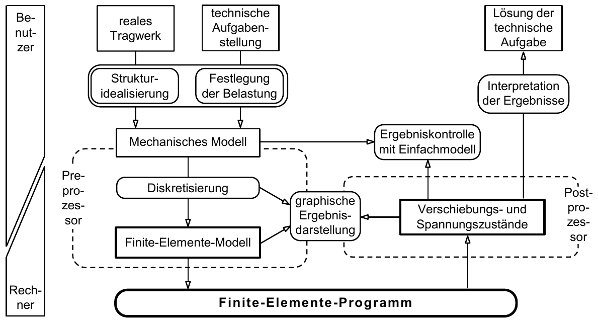 Der Weg zu einer validen FE-Simulation ist mehrstufig und interdisziplinär. In Abbildung Abb. 1.1 sind die eigentlichen Schritte, die die Finite-Elemente-Methode betreffen, durch einen dicken Rahmen gekennzeichnet. Die vor- und nachgelagerte Prozesskette sollte von dem/der berechnenden Ingenieur/in eng begleitet werden, denn die Ergebnisse einer Simulation können nur so gut sein wie die Eingangsdaten: Garbage in, garbage out.