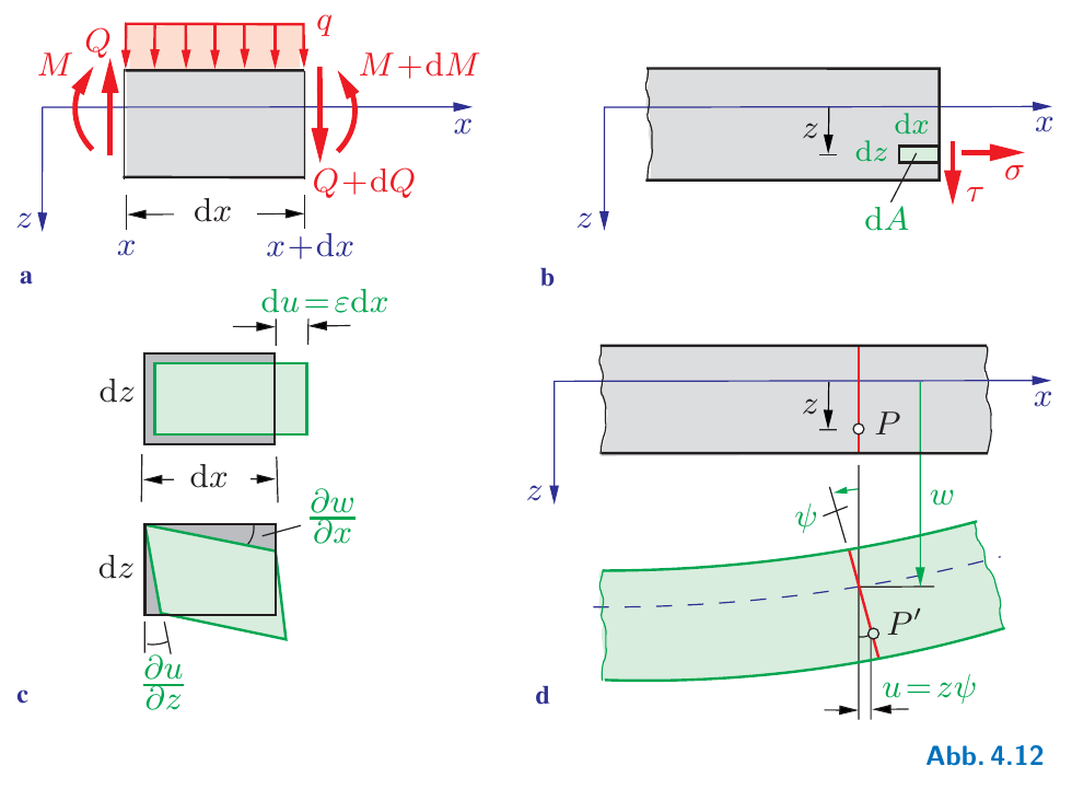 Abb. 2.12 Kräftegleichgewicht, Spannungen und Schnittgrößen am geraden Balken nach [Gross et al., 2007]#