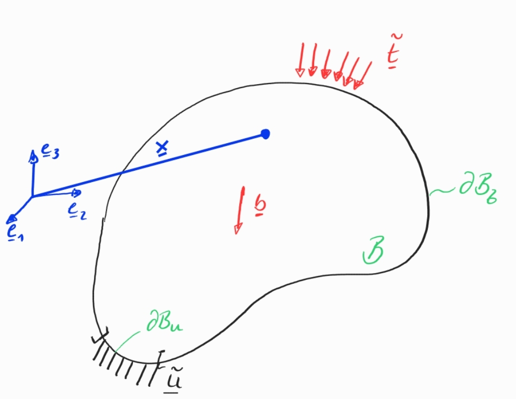 Diese starke Form wird jetzt mit einer beliebigen vektorwertigen Testfunktion \(\delta \bm{u}\) multipliziert und über das betrachtete Gebiet \(\mathcal{B}\) (den betrachteten Körper) integriert.