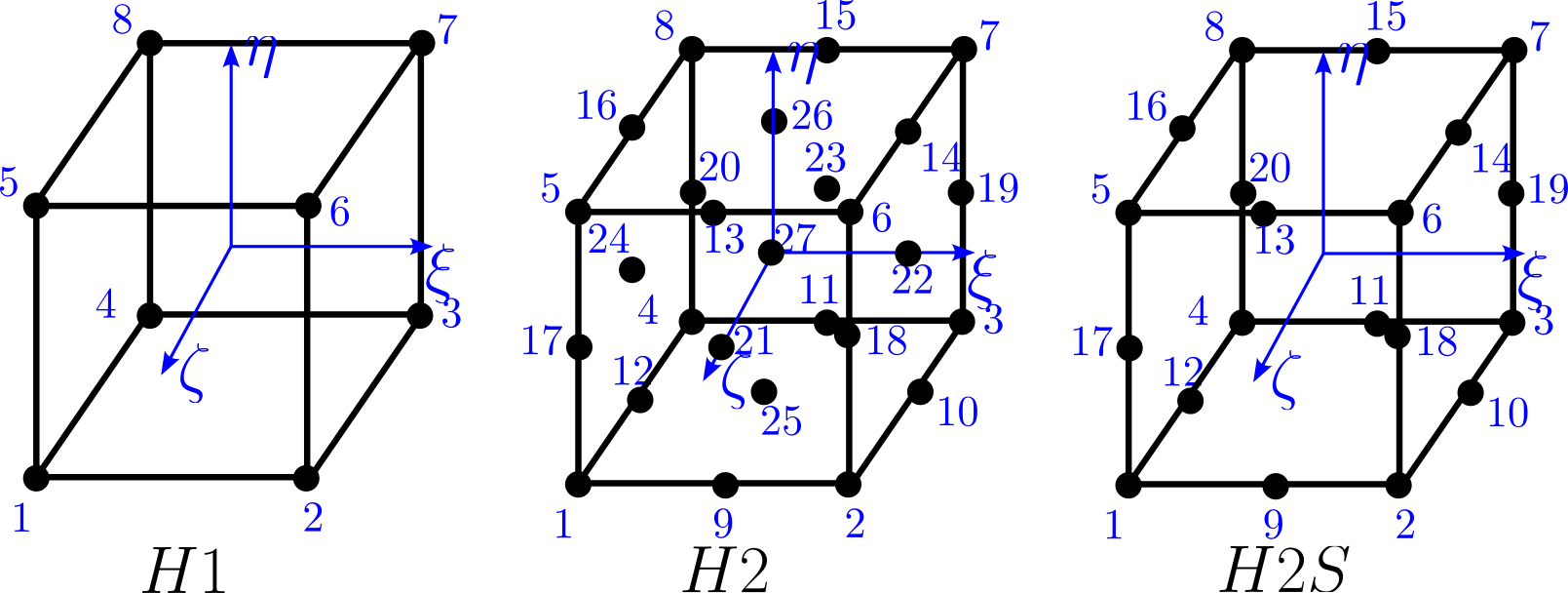 Abb. 8.11 3D-Hexaeder-Elemente mit linearer (8 Knoten) und quadratischer (27 Knoten) Approximation. Zusätzlich ist das 20-Knoten-Hexaeder-Serendipity-Element gezeigt.#