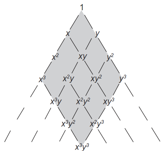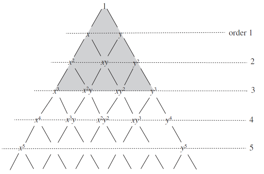 Hier sind für ein 3-Knoten-Dreieckselement alle linearen Terme enthalten, für ein 6-Knoten-Dreieckselement sind auch die quadratischen und bilinearen Terme enthalten. Illustriert kann man sich am besten ein pascalsches Dreieck wie in Abbildung Abb. 8.1 vorstellen.