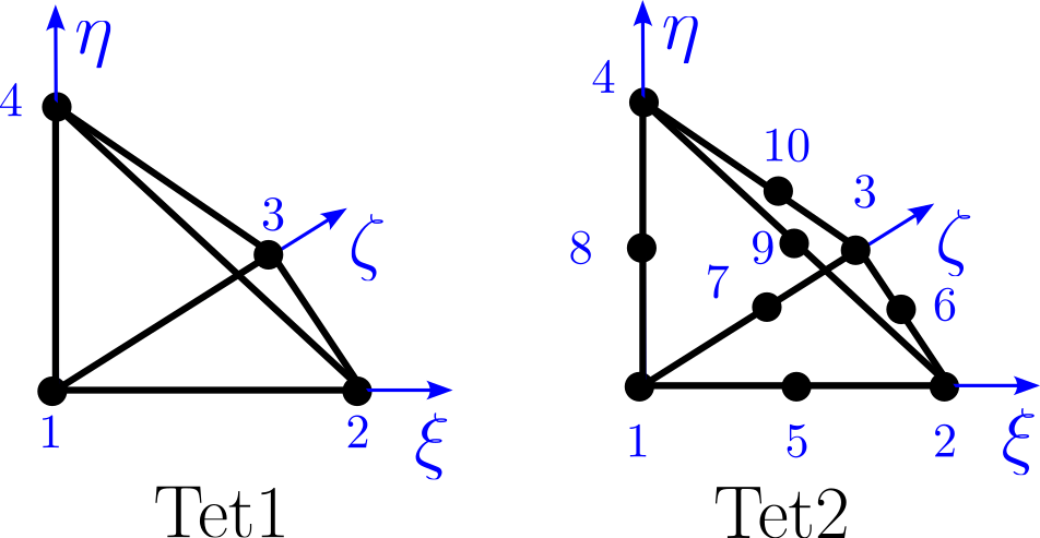 Für tetraedrische Elemente implementieren gängige FEM-Programme Tetraeder mit entweder 4 oder 10 Knoten. Diese sind in Abbildung Abb. 8.12 dargestellt.