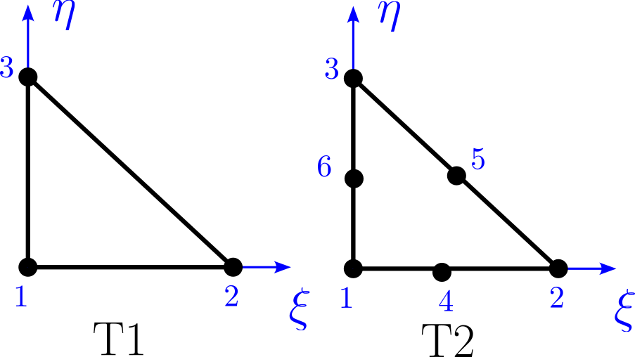 Abb. 8.9 Dreieck-Elemente mit linearen (T1) und quadratischen (T2) Formfunktionen.#