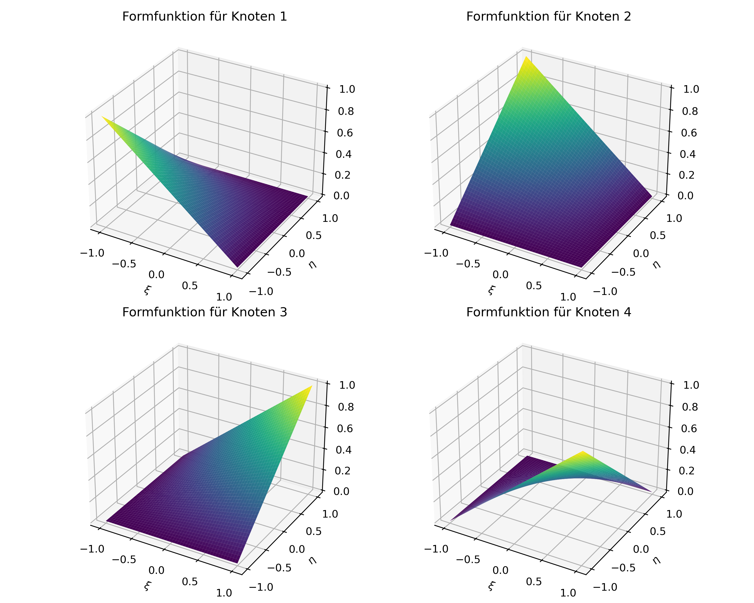 Im 2D-Fall werden die Formfunktionen für Rechteck-Elemente als Tensorprodukt der 1D-Formfunktionen definiert. Für ein 2D-Rechteck-Element mit 4 Knoten (lineares Element) sind die Formfunktionen: