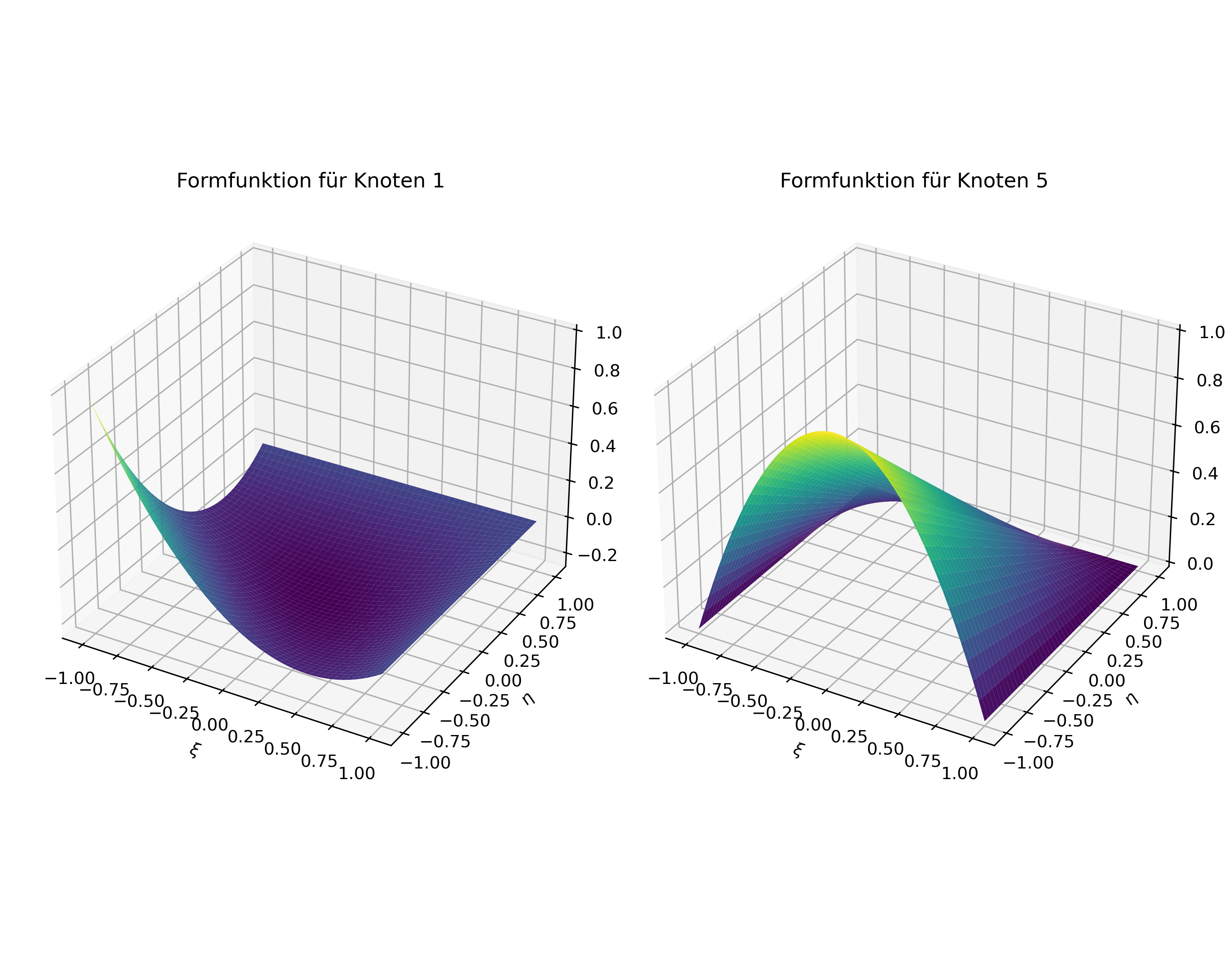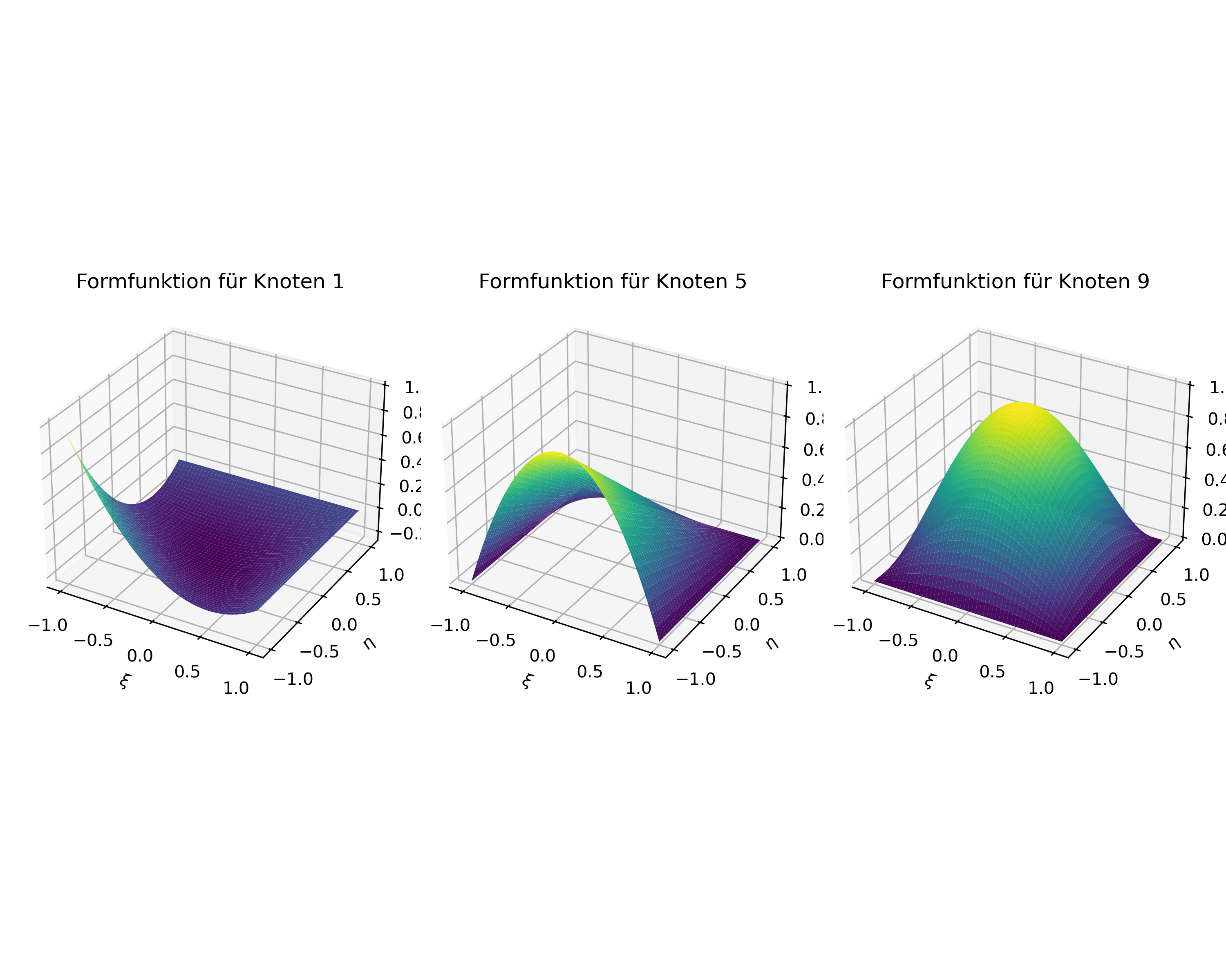 Im 3D-Fall werden die Formfunktionen für Hexaeder-Elemente als Tensorprodukt der 1D-Formfunktionen definiert. Für ein 3D-Hexaeder-Element mit 8 Knoten (lineares Element) sind die Formfunktionen: